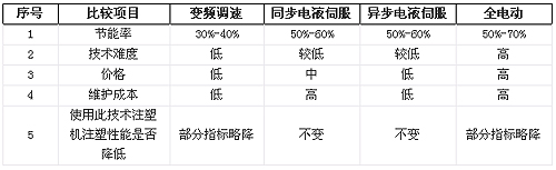 根据以上分析,全电动节能率最高,但技术难度、价格和维护成本高,只有少量大企业才能有能力研发,规模生产至少要3-5年后,因此,电液伺服是当前注塑机技术发展的最主要趋势,也是能最快形成规模化生产的方式,异步电液伺服性能和同步伺服性能一样,但价格更低,维护更简单,因此,异步电液伺服取代同步电液伺服是大势所趋。