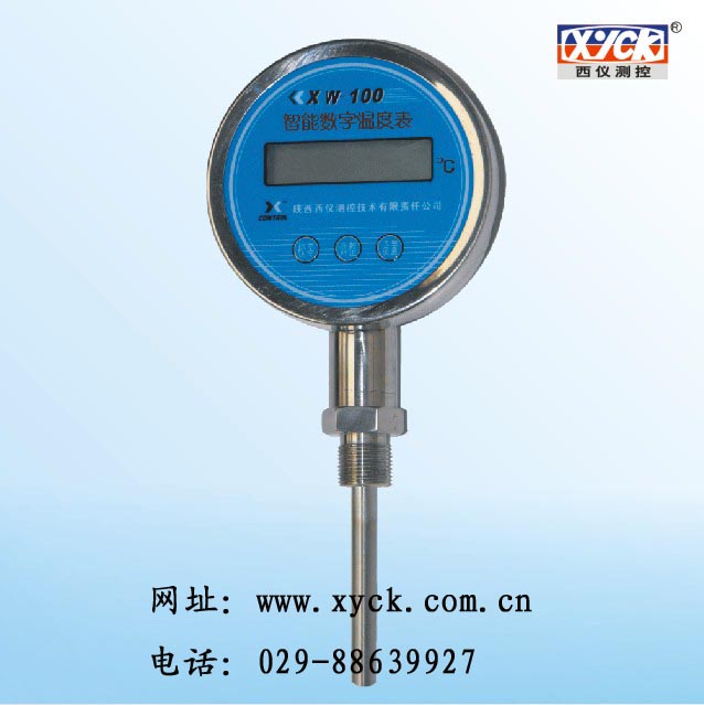 XW-100智能数字温度表 --> 产品介绍: 概述 本精密数字温度表是采用16位单片机控制,专业的扩散硅传感器及耐腐的304不锈钢壳体。壳体结构为密封型,防止雨水和露水进去。按键采用磁感应式非接触按键,感应灵敏密封性好。电池使用的是高能锂离子电池长期供电方式、无需外接电源,安装使用方便。 数字压力表从根本上克服了指针式温度表精度低、可靠性差、损坏率高等诸多缺点。尤其在腐蚀、振动等场所使用,更显其超凡性能。 产品特点: 大屏幕;液晶显示包含数字直观显示和模拟动态条参考显示两种合一,读数直观明了。 可加背光方便夜间读数。 高精度;先进的微处理器,专业的进口PT100温度传感器,性能稳定精度高。 低功耗;超低功耗智能控制,带开关。电池连续使用二至三年。 电池有电量报警,方便提醒客户更换电池。 防腐蚀;整体不锈钢密封结构,外观没有一个螺丝,适应腐蚀性介质环境。 按键采用磁感应非接触按键,开关机方便。 耐振动;器件防振处理,紧固组装,在振动场所正常使用。 技术参考: 测量范围;-20-100℃ 精度等级; 0.5、1.0 FS 显示精度;6位(LCD) 工作电压;3.6V锂电池供电 采样时间;出厂设定10秒/次(可按用户要求设定) 适用介质;与不锈钢兼容的液体、气体 介质温度;-40~85℃ 环境温度;-20~60℃ 安装螺纹;M27×2.0(特殊安装用户要求) 电池寿命:5年(待机状态) 应用场合: 广泛应用于石油、化工、化纤、冶金、等工业部门